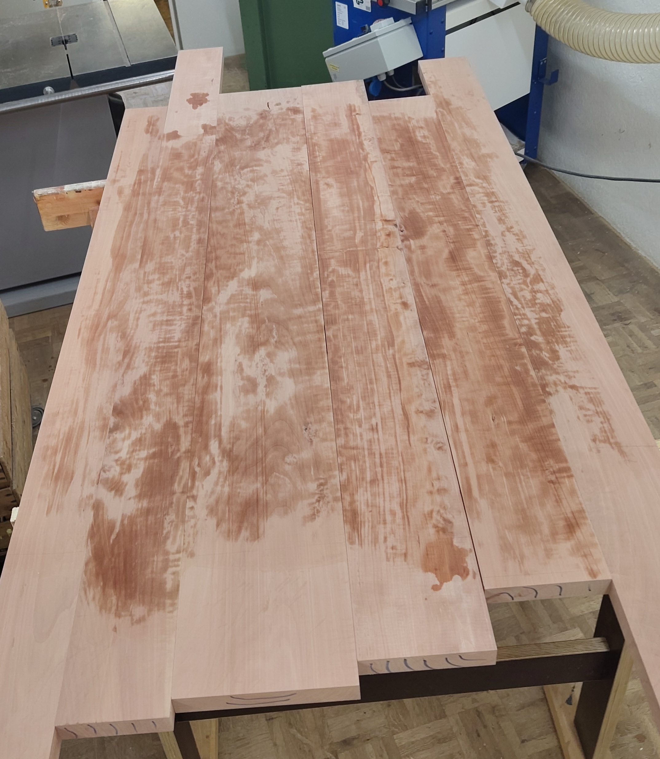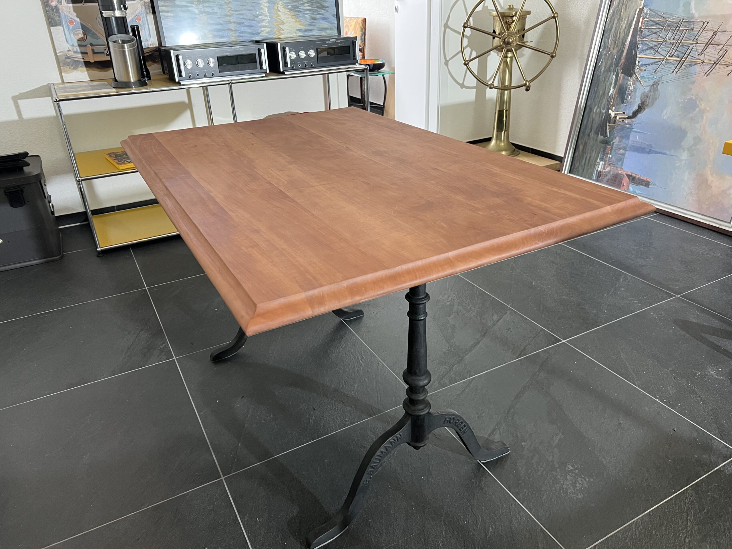 Beizentisch (120 x 80) aus einheimischer Birne. Vintage Gusseisenfüsse von Emil Baumann. Geölt.